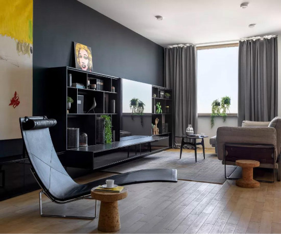 除了白色與淺灰,黑白灰作為經典配色方案,把黑色或是深灰色作為墻面搭配的話,那么整體空間效果都會顯得格外的端莊有檔次了。
