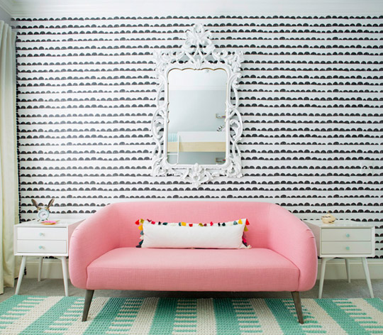 粉色的沙發,在層次感十足的黑白墻壁映襯下,奪人眼目。清新質樸,時尚簡約,三兩個簡單設計便輕松營造出現代主義下的空間感。