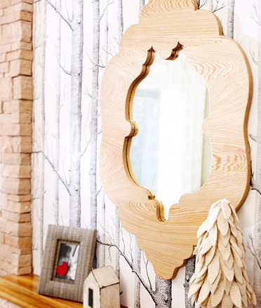 千萬別被鏡子的花哨外框唬弄了,其實它是由一塊長5.4m的柏木切割成8段粘合成的。每塊長方形板子的長度為66cm,為了使鏡框上的紋理顯得更自然,在粘合木板的時候翻轉其中的幾塊。在板子的一邊繪出鏡框的圖案設計,使用豎鋸切割,在處理中間的部分時,需要先鉆一個小洞,再插入豎鋸。切割完的板子邊緣要用砂紙打磨光滑,最后粉刷清漆,從背面卡牢鏡面。