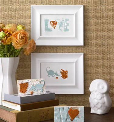 將木塊制成有趣的印章,不用你有如何精湛的纂刻技術,我們就是保留下這份簡單而粗糙的質感。可以是稍顯復雜的動物圖案,也可以是幾個簡單的字母搭配,刷上你喜歡的色彩,印制成富有個性化的裝飾畫,或者就這樣拿來作為一件裝飾小物也是很好的創意之舉。