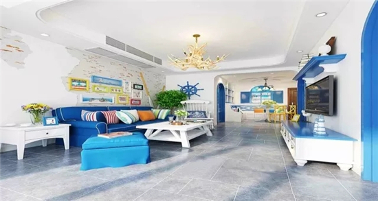 地中海民族風的客廳裝修,家具都是白色的,搭配藍白的軟裝,搶眼的沙發墻是夢幻的星空,仿古的燈具與風扇,色彩絢麗的同時透露出驚人的簡潔。不用說了,設計師很厲害。