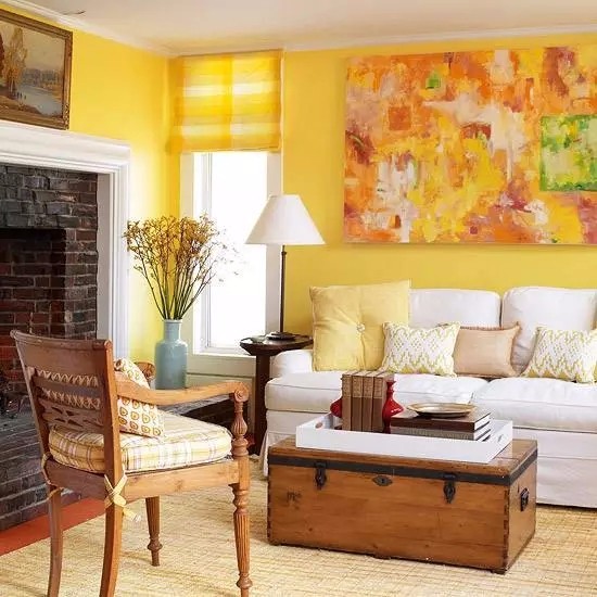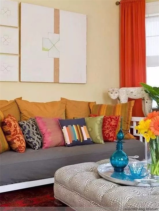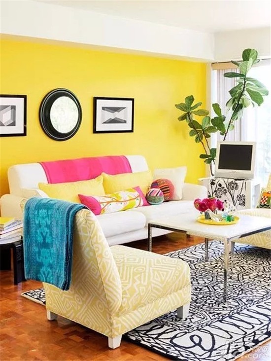 鮮黃色的陽光氣息的墻面,白色的長沙發上用了活潑色彩的軟裝搭配。特別的棕色的木質地板,不僅色調壓制住了過于輕狂的軟飾,木頭的紋路也豐富了客廳的味道,真的很漂亮。