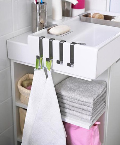 不過只要作出小調整,小物品就會被收拾得妥妥帖帖。浴室的五金掛件,既可以作為最省事的毛巾架,也可以盡量收納各種小物品,最妙的就是不容易產生“內部矛盾”,因為五金掛件給小物品預留足夠的位空間。